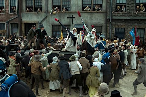 Há muita contextualização histórica em Peterloo, além de verdadeiras maratonas de diálogos e discursos — ambas coisas que exigem plateias dispostas a colocar toda a sua atenção a serviço do filme. Mas ele tem considerável poder de ecoar no presente: o massacre de Manchester é um caso exemplar de como a miopia e a covardia políticas podem agravar um impasse até o ponto do insustentável. Não havia nada que as classes dominantes inglesas temessem mais que uma reprise em solo britânico da Revolução Francesa, de 1789, com sua abolição violenta da aristocracia e da monarquia. Exceto, talvez, uma reprise da Guerra de Independência americana, de 1775-1783, em que a coroa fora derrotada por sua ex-colônia em nome justamente dessa bandeira, a de que à taxação deve corresponder a representação política. O norte da Inglaterra era então o berço fervilhante da Revolução Industrial — junto com a qual nascera uma classe nova, o operariado, sujeita a níveis até ali inéditos de exploração, e clamorosa por direitos também inéditos. A fome, além disso, grassava. Medo e paranoia de um lado, insatisfação e aspiração do outro e, no meio deles, destacamentos de cavalaria com as baionetas à mostra: essa foi a receita do desastre.
